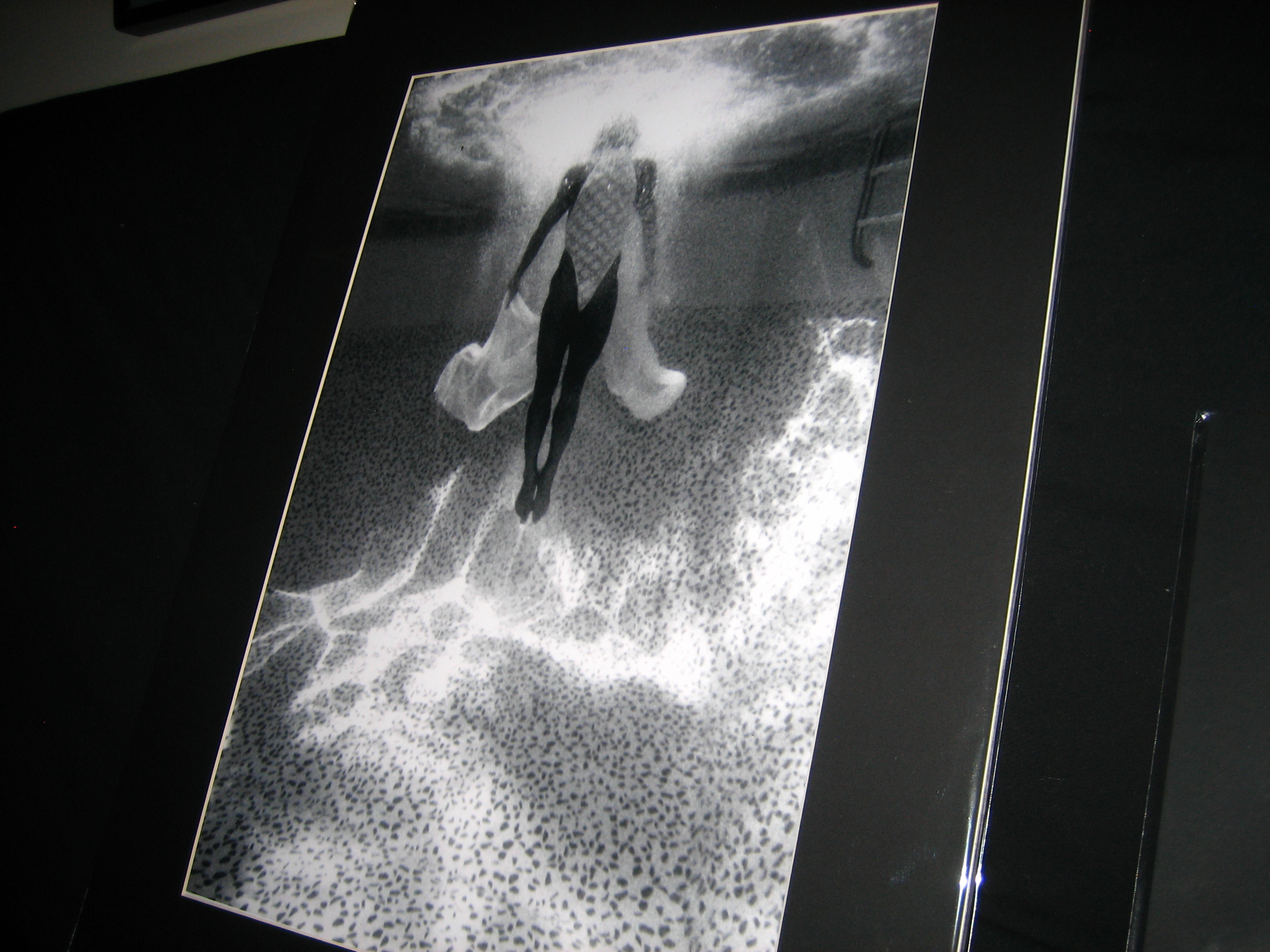 Calvin came to my home yesterday and brought prints that I received for doing the shoots in the 1990’s. Calvin surprised me and gave me many more prints than I was owed. One below, well, I became very emotional and cried, and praised God as I have never seen it before. Calvin asked me if I could dive. Of course as I was a Philly little girl and went to the local rec center to swim. There wasn’t anyone in my neighborhood that could have a pool. We had cement 2 ft by 4 ft concrete yards. Also, I became a Physical Education teacher at Temple University and taught in the Philly school system for a couple of years. It was a four-hour shoot in a 50 degree outdoor pool. Calvin was in an Oxygen tank with camera below at the surface of the pool. I dove into the pool, hit bottom, arched up with a chiffon scarf. Calvin capture only one photo worth printing. It is below.